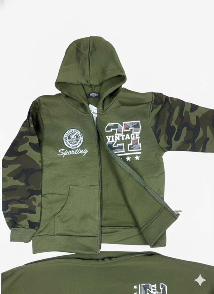 Stoer en warm joggingpak voor jongens in een mooie donkergroene kleur. De hoodie heeft camouflage-mouwen, een praktische rits en een zachte, warme binnenkant voor extra comfort. De bijpassende joggingbroek maakt de look volledig af. Perfect voor koude dagen, school, of een comfy dag thuis.