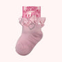 De sokjes zijn afgewerkt met een glanzende satijnen rand en een hartje van strass-steentjes.