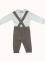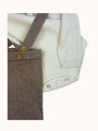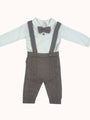 Deze stijlvolle gebreide babyset in beige en taupe bestaat uit een zachte romper met strik en bretellen en een bijpassende broek met kabelmotief. De luxueuze afwerking en comfortabele pasvorm maken deze set ideaal voor feestjes, fotoshoots of als geschenk.