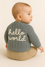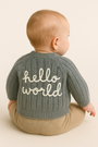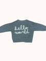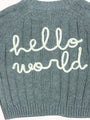 Deze unisex babytrui in neutraal grijs is gemaakt van zachte gebreide stof en afgewerkt met een speelse “hello world” tekst in 3D-effect. Warm, comfortabel én perfect als kraamcadeau of eerste herfstoutfit.
