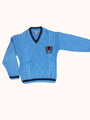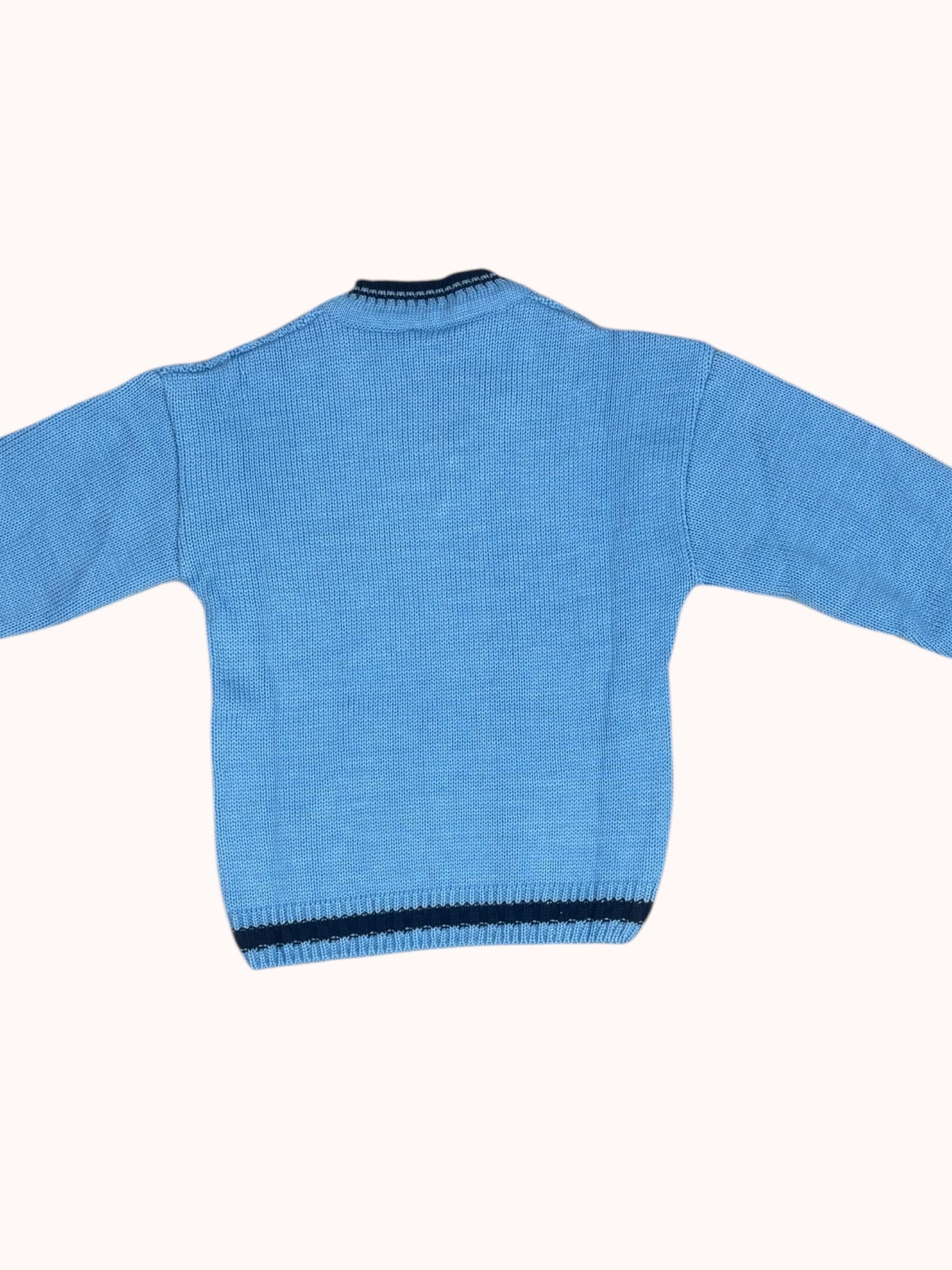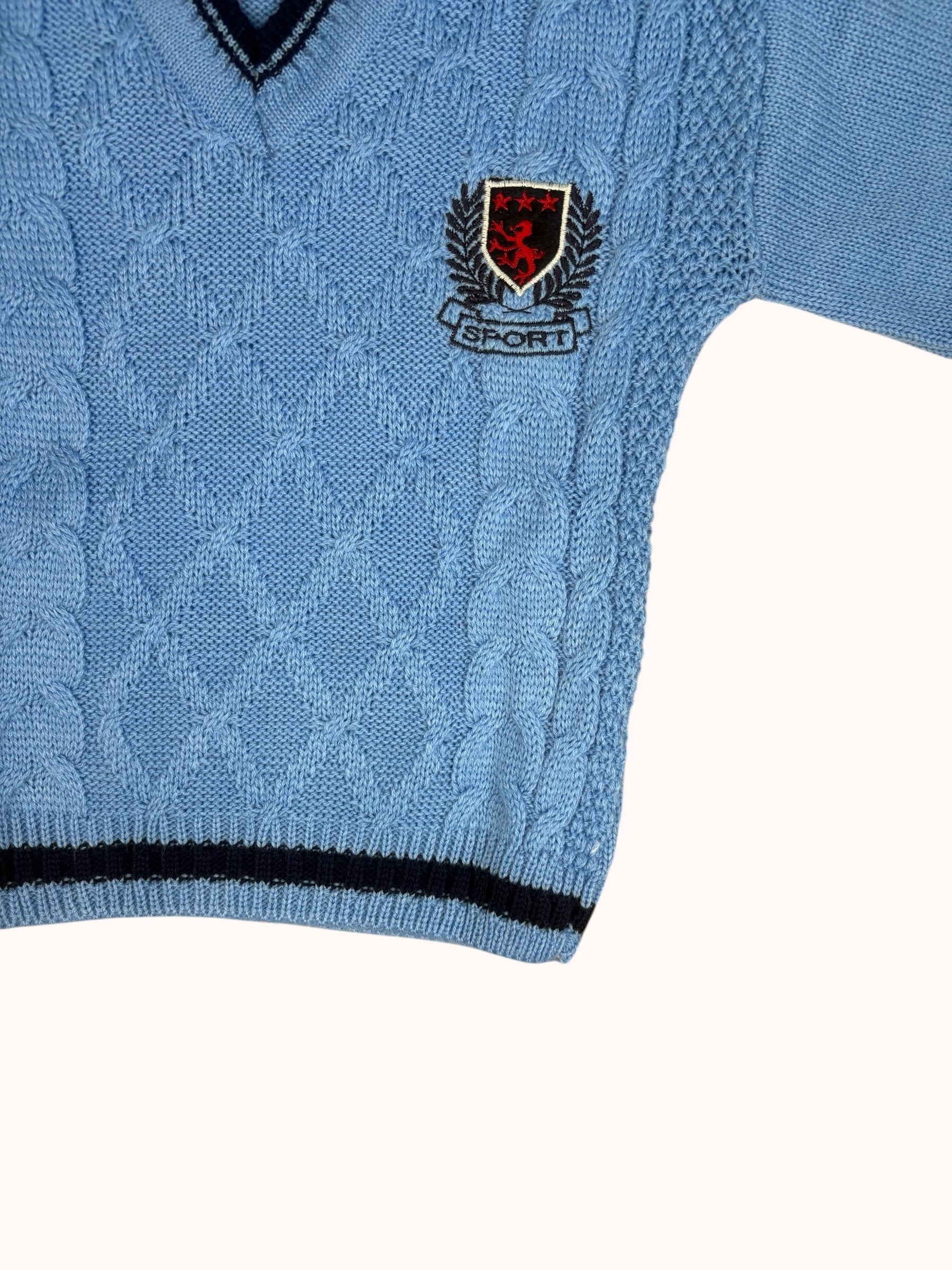 Lichtblauwe jongenstrui met V-hals, kabelpatroon en sportieve patch. Gemaakt van zacht breisel met donkerblauwe accenten – comfortabel én modieus voor elke gelegenheid.