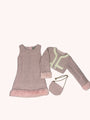 Deze meisjes set bestaat uit een roze jurk met subtiel patroon en zachte bontafwerking. Het bijpassende vestje is voorzien van fijne details en bont aan de mouwen, wat zorgt voor een elegante uitstraling. Het schattige tasje met gouden ketting maakt de outfit compleet. Ideaal voor verjaardagen, feestjes of familie-uitjes waarbij je meisje er verzorgd en modieus wil uitzien.