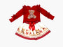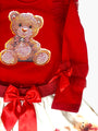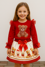 Deze feestelijke tweedelige set bestaat uit een rode top met lange mouwen en een rokje met teddybeerprint.