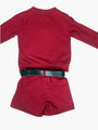 Deze hippe set bestaat uit een rode sweater met een schattige teddybeer-applicatie en een bijpassende short met stijlvolle riem. De zachte stof en warme kleur maken dit de ideale herfst- of winteroutfit voor meisjes van 4 tot 14 jaar.