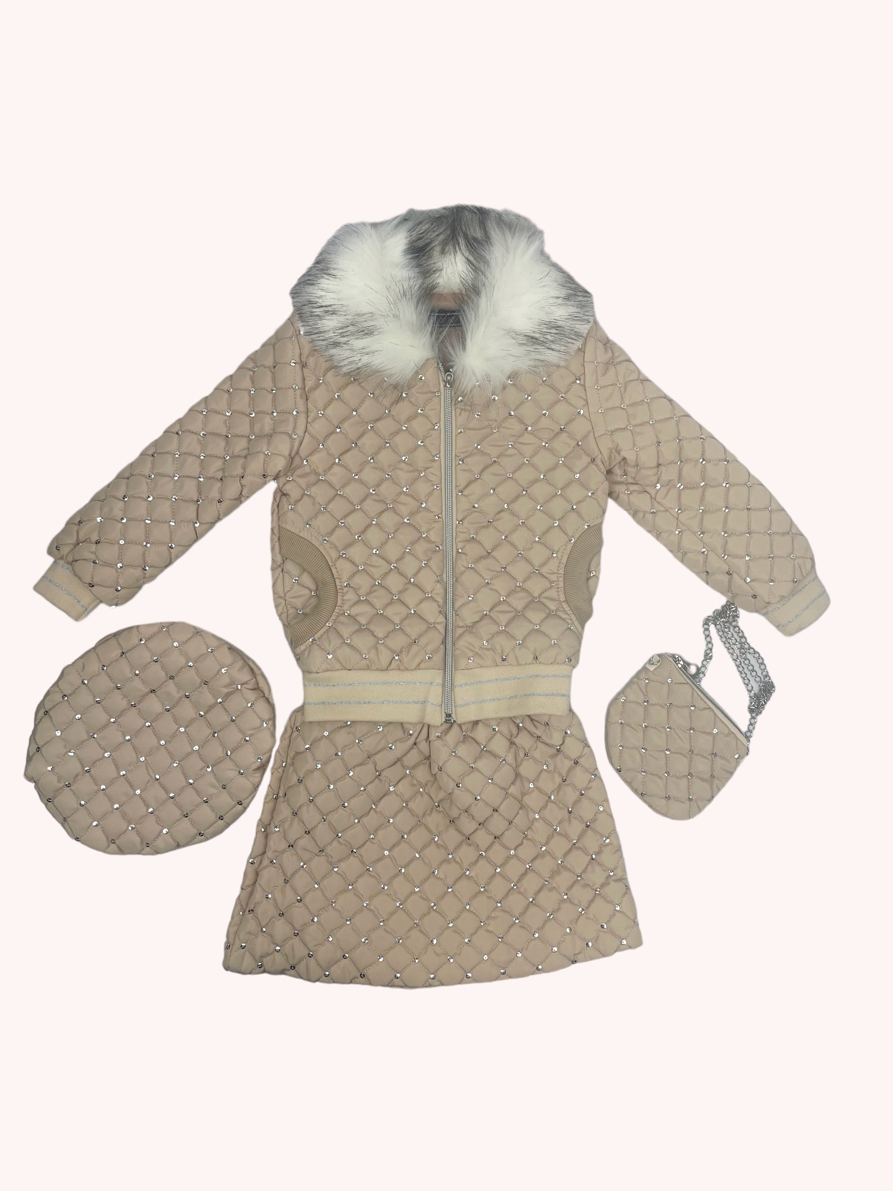 Deze set in beige, bestaat uit een jas met ritssluiting en opvallende witte bontkraag, een bijpassende rok, een schattig hoedje en een klein tasje met zilverkleurige ketting. Zowel de jas als de rok zijn afgewerkt met een doorgestikt ruitpatroon en subtiele diamantdetails die zorgen voor een elegante en luxueuze uitstraling.