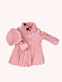 Schattige baby meisjes set met een roze longsleeve, grijs jurkje met stippenprint en een elegante roze jas met bloemendetails.