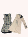 Stijlvolle meisjes set bestaande uit een zwart-beige geruite jurk en een elegante beige jas met fijne borduursels en knoopsluiting. De jurk heeft een speelse uitstraling dankzij de dubbele knopenrij en een subtiel geplooid rokje